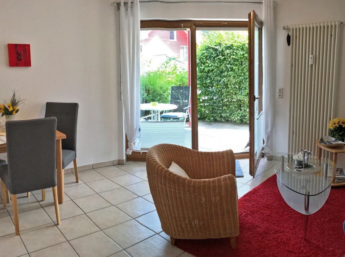 Die modern und hell eingerichtete Wohnung liegt im Erdgeschoss des Hauses. Im Wohnzimmer steht eine bequeme Sitzecke mit Sesseln und einer Couch, auf der eine weitere Person übernachten kann. Vom Wohnraum gelangen Sie auf die mit Gartenmöbeln ausgestattete Terrasse. Das Badezimmer hat eine Dusche. Im separaten Schlafzimmer befinden sich ein Doppelbett mit Nachttischen und einem Kleiderschrank.